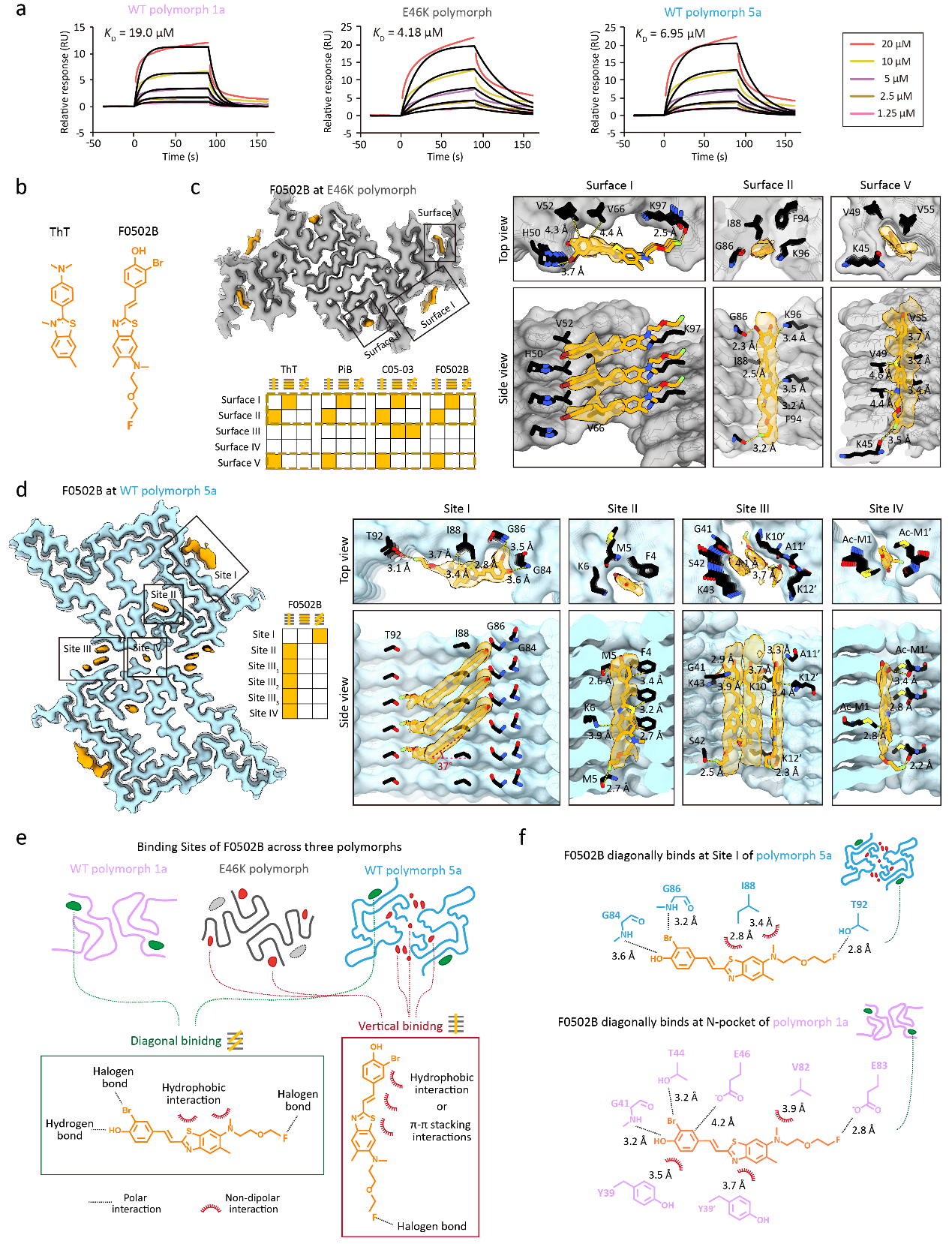 (a)表面等离子共振技术分析F0502B与三种α-syn amyloid polymorphs的亲和力。(b)ThT与F0502B的化学结构。(c, d)F0502B与E46K polymorph(c)和WT polymorph 5a(d)的结合情况。分别展示了F0502B与两种polymorphs形成的复合物的冷冻电镜密度图、F0502B在两种polymorphs中的结合位点与结合模式的二维分析、以及F0502B在各个结合位点的放大图。(e)F0502B在不同polymorphs中的结合位点的总结与分类。(f)F0502B与WT polymorph 5a Site I (上)以及WT polymorph 1a N-pocket(下)的相互作用图谱。