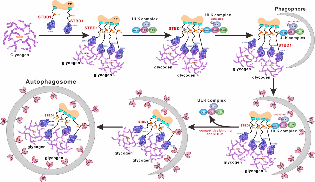 糖原作为哺乳动物细胞内储存葡萄糖的主要形式,是细胞内最重要的供能物质之一。在哺乳动物细胞中,糖原的分解代谢主要包括两条不同的途径:(1)胞质糖酵解过程;(2)溶酶体依赖的糖原自噬过程(glycophagy)。糖原的分解代谢对于维持血糖平衡、细胞能量供给至关重要,其异常与众多的人类疾病密切相关,例如庞贝氏症(Pompe’s Disease)。庞贝氏症是一种由于溶酶体酸性葡萄糖苷酶功能缺陷导致糖原在溶酶体中异常累积的糖原累积病,其发生进一步强调了糖原自噬过程的重要性。STBD1是哺乳动物细胞内目前唯一已知的参与糖原选择性自噬的自噬受体蛋白,但是目前对于STBD1如何选择性地识别糖原以及如何介导糖原自噬的具体分子机制仍然未知。