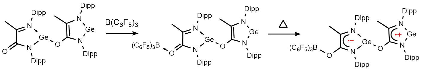 有机Donor-Acceptor(D-A)分子在有机半导体、光电探测器、光伏器件等方面有着广泛的应用。目前来看,大部分有机D-A分子包含B,N,P,S等元素,由于十四族元素的价层电子为半充满,因此含有十四族元素(Ge,Sn等)的有机D-A分子非常稀少。最近,中国科学院上海有机化学研究所的王新平教授与同单位的薛小松教授合作,成功制备了首尾相接的锗宾D-A分子,并发现Lewis酸的耦合导致双-锗宾D-A分子表现出热激发三线态自由基特性(图2)。
