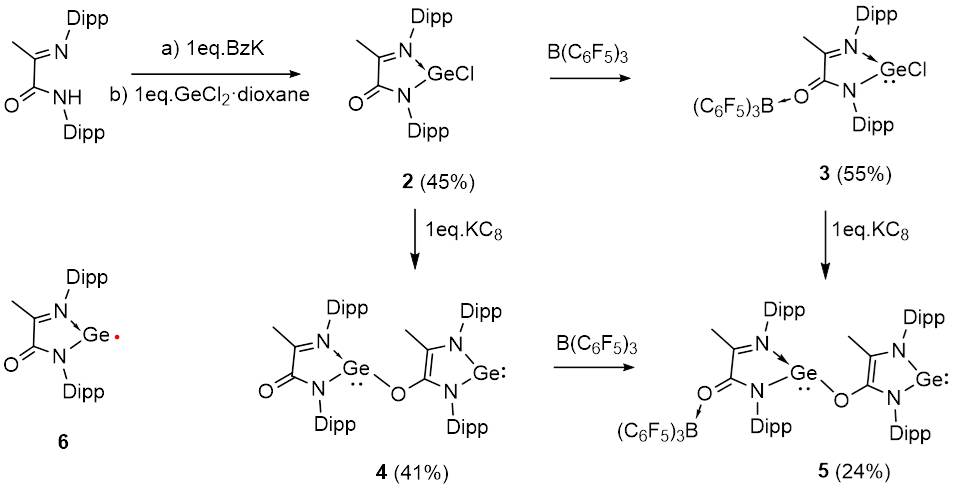 课题组以α-亚氨基羧酰胺为原料出发,得到了双-锗宾4和BCF配位的双-锗宾5(图3)。4和5的晶体结构中都包含两个通过氧桥联的“GeNCCN”五元杂环。 其中拥有吸电子基团(C=O)的“Ge1NCCN”五元杂环可视为acceptor,另一个杂环为donor(图4)。从2制备双-锗宾4的过程中,他们推测该还原过程会先形成瞬态锗(I)单自由基6。该自由基在溶液中极具活性,并迅速攻击另一分子的氧原子,形成稳定的首尾二聚体4。