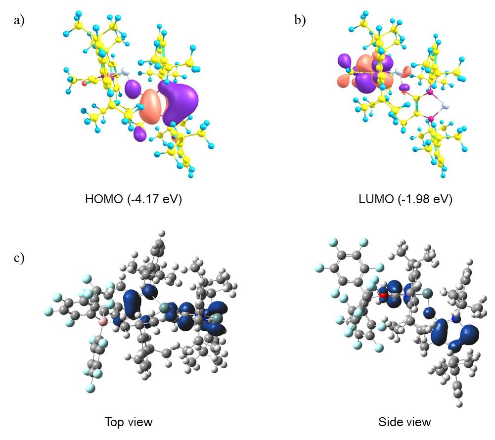图5 双-锗宾4 的HOMO (a) 和LUMO (b) 以及5的三线态自旋密度分布 (c)