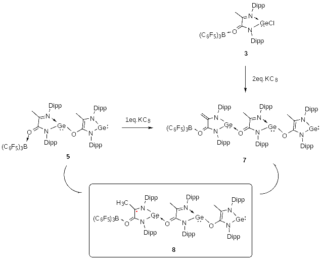 5还可以进一步反应得到化合物7(图6),其晶体结构中包含三个通过氧桥联的“GeNCCN”五元杂环。表征发现,在300到360 K的温度范围内,7具有逐渐增强的EPR信号,且磁化率与温度的乘积