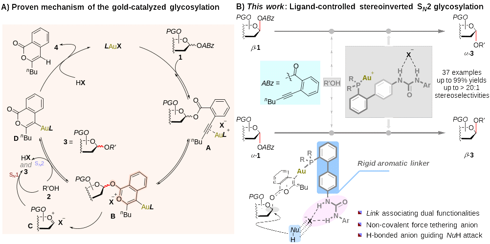 近期,该团队利用脲基团的氢键导向能力和刚性膦配体骨架,设计合成了一系列双功能Au(I)催化剂,成功实现了高立体选择性的给体构型翻转型“俞氏糖苷化反应”。该策略无需在糖基给体上安装立体导向基团,底物适用范围广,可同时实现α构型和β构型糖苷键的精准构建,具有广泛应用潜力。此类双功能Au(I)催化剂的成功开发也为个性化的立体选择性糖苷化反应以及其它金催化反应的立体化学控制提供了新思路。
