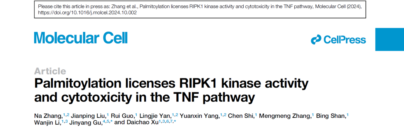 2024年10月28日,中国科学院上海有机化学研究所生物与化学交叉研究中心许代超课题组在Molecular Cell杂志在线发表了题为“Palmitoylation licenses RIPK1 kinase activity and cytotoxicity in the TNF pathway”的研究论文,报道了RIPK1介导细胞死亡的启动机制,揭示了该机制以泛素化依赖的棕榈酰化的形式调控RIPK1的激活和程序性细胞死亡的分子机制。