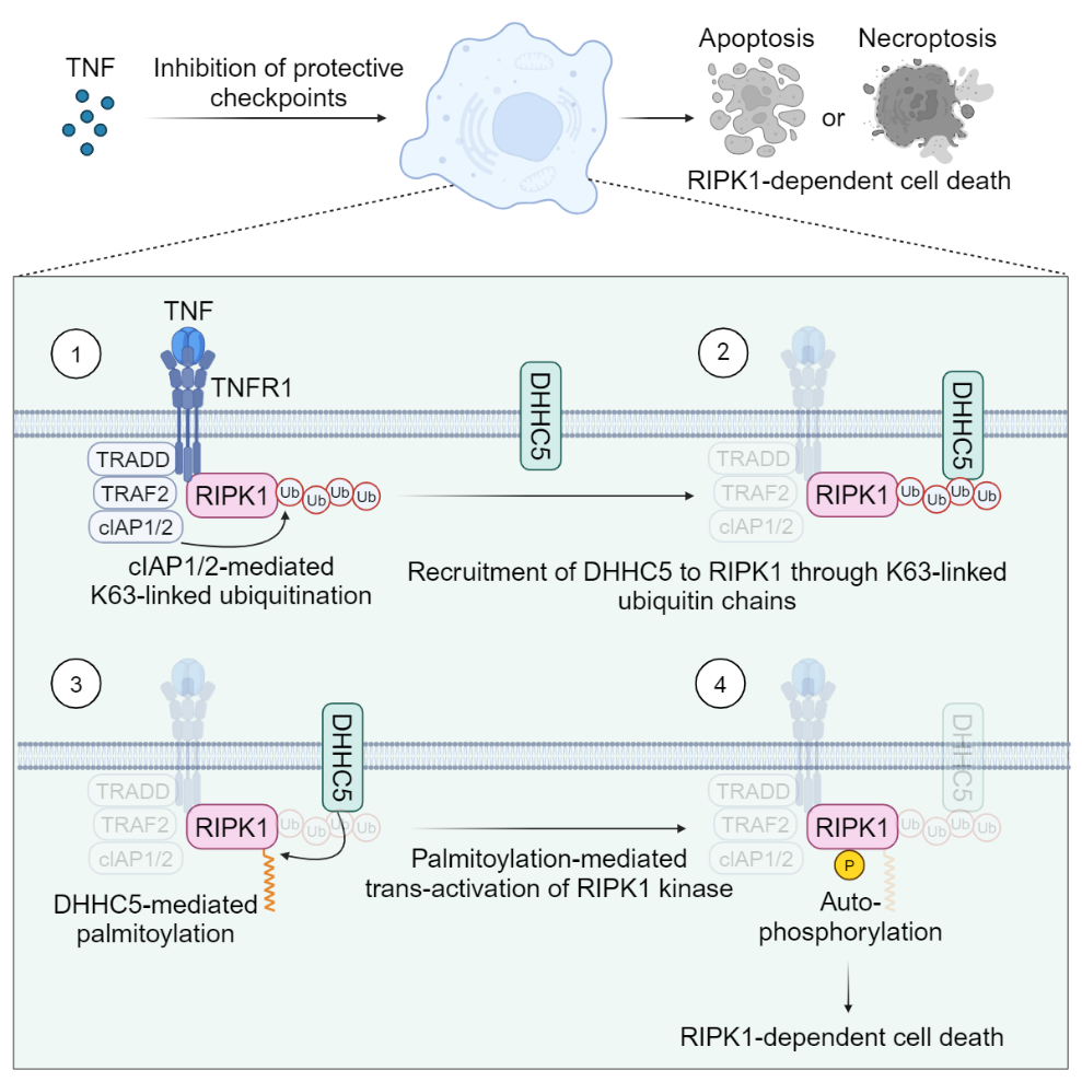 现有的理论认为,RIPK1的激活通过二聚体内的反式自磷酸化进行,这意味着其激酶结构域需要发生同源相互作用。然而,目前还不清楚RIPK1激酶结构域如何实现这种同源互作以促进自身磷酸化激活。该研究结果建立了以下模型详细阐明了当细胞死亡检查点被破坏时,RIPK1介导的细胞死亡如何被启动:①当细胞感应到TNF后,RIPK1被迅速招募到临近细胞膜区域的TNF受体复合物;在该复合物中,RIPK1在E3酶cIAP1/2的作用下发生K63连接的泛素化修饰。②这些K63泛素链会招募定位于细胞膜上的DHHC5,使之靠近RIPK1。③随后,DHHC5催化RIPK1激酶结构域上的棕榈酰化,增加激酶结构域的疏水特性,促进其同源相互作用;④在细胞死亡检查点受阻的情况下,上述过程可以增强RIPK1的反式自激活,最终导致下游的RIPK1介导的细胞死亡,包括凋亡和程序性坏死(图1)。