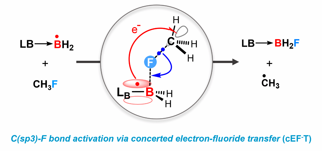 近期,中国科学院上海有机化学研究所的薛小松研究员团队在《德国应用化学》(Angewandte Chemie International Edition)上发表了一篇题为“C(sp3)-F Bond Activation by Lewis Base-Boryl Radicals via Concerted Electron-Fluoride Transfer”的研究论文(Angew. Chem. Int. Ed.2024,e202415715)。该研究通过DFT计算深入探讨了路易斯碱-硼自由基直接活化C-F键的机理和选择性,揭示了该类自由基活化C(sp3)-F键的独特“协同电子-氟负离子转移”(cEF-T)机制,并进一步设计出能够以较低能垒活化C(sp3)-F键的路易斯碱硼自由基物种(图1),为碳-氟键活化的研究提供了新的思路。