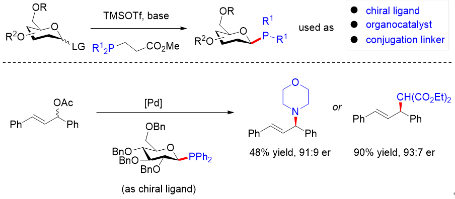 新颖手性配体的开发对于过渡金属催化的不对称ƞ3-取代反应具有重要意义。金属有机化学国家重点实验室何智涛课题组一直致力于非经典的ƞ3-取代反应研究,即摆脱传统α-位杂原子离去基的要求,解决非对称烯丙基底物的高立体选择性取代难题。前期,该课题组相继开发了膦-亚胺双齿配体用于不饱和烃的不对称氢氧化(J. Am. Chem. Soc. 2023, 145, 3915-3925.),以及改良PyBOX类配体用于远程离去基参与的不对称炔丙基取代中(Angew. Chem. Int. Ed. 2023, 62, e202314517.)。在这些基础上,该课题组进一步通过发展三价膦苷化反应,设计合成了一系列新型手性糖基膦配体,并成功应用于钯催化的不对称烯丙基取代反应中(Angew. Chem. Int. Ed. 2024, e202420355.)。
