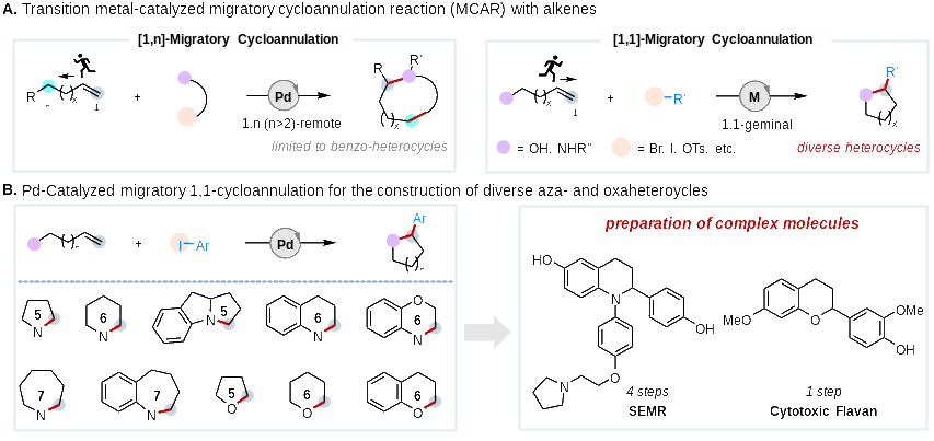 王鹏课题组利用钯催化实现了非活化烯烃的1,1-迁移环化反应 (MCAR),该反应条件温和,具有优秀的官能团兼容性。底物中的酚羟基对迁移环化反应发挥了至关重要的作用,经由亚甲基醌中间体控制金属迁移的反应和环化反应的位点。使用该策略能够实现一系列不同尺寸大小氮杂环和氧杂环的合成。此外,该方法也可以应用于复杂分子的合成,进一步体现在合成中的应用潜力。