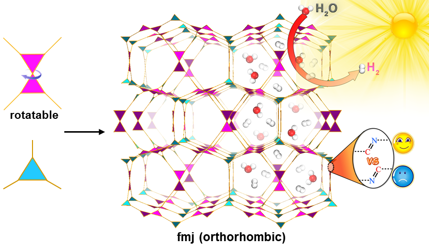 图1.可旋转单体构筑正交晶系fmj拓扑3D COF和连接键取向异构及其光催化分解水析氢性能差异的示意图。