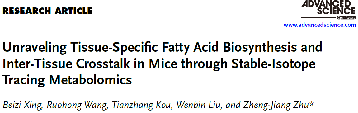 近日,中国科学院上海有机化学研究所生物与化学交叉研究中心朱正江研究员团队在Advanced Science期刊发表题为“Unraveling tissue-specific fatty acid biosynthesis and inter-tissue crosstalk in mice through stable-isotope tracing metabolomics”的研究论文(Advanced Science, 2025, e03662)。该工作利用稳定同位素示踪代谢组学技术,系统性地揭示了小鼠体内脂肪酸的组织特异性生物合成模式及其在各组织间的代谢交流。