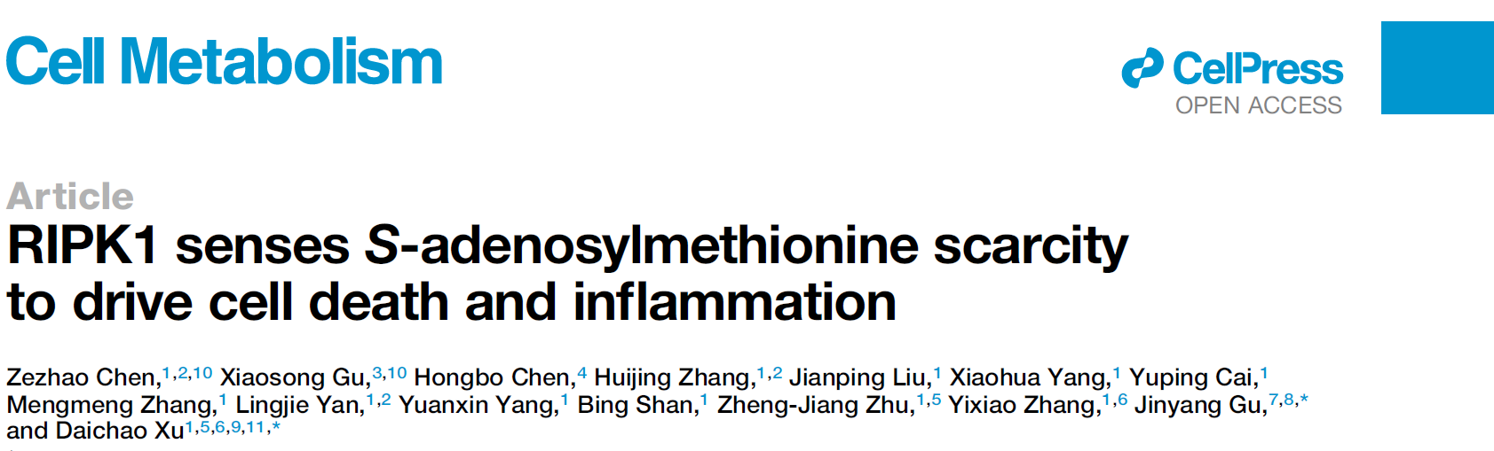 2025年6月25日,中国科学院上海有机化学研究所生物与化学交叉研究中心许代超研究团队在Cell Metabolism杂志在线发表了题为“RIPK1 senses S-adenosylmethionine scarcity to drive cell death and inflammation”的研究论文,揭示了受体互作蛋白激酶RIPK1在感知营养物质缺乏中的作用,并阐明了RIPK1感知甲硫氨酸及其代谢物SAM的水平,从而控制代谢变化所介导的细胞生死抉择的分子机制。