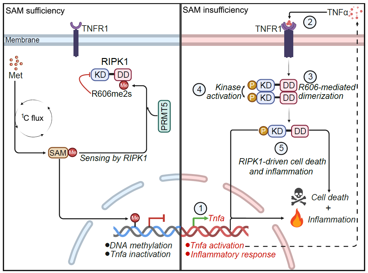 图1. RIPK1感知甲硫氨酸和SAM丰度以控制细胞生死和炎症的机制模型