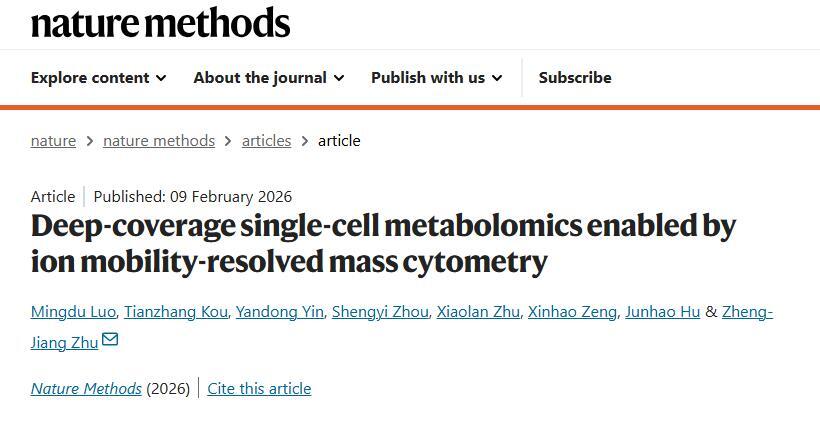 近日,中国科学院上海有机化学研究所生物与化学交叉研究中心朱正江研究员团队在Nature Methods杂志发表了题为“Deep-coverage single-cell metabolomics enabled by ion mobility-resolved mass cytometry”的研究论文(https://doi.org/10.1038/s41592-025-02970-2)。该研究的相关工作同时也被Nature Methods以Research Briefing形式进行报道。该研究构建了一套基于离子淌度质谱流式的单细胞代谢组学分析平台,并系统发展了离子淌度选择性富集(selective ion accumulation)与细胞信号叠加(cell superposition)策略,有效提升了小分子代谢物检测的灵敏度与分析稳健性。结合自主开发的数据分析算法与软件 MetCell,该技术实现了兼具高通量、深覆盖、超灵敏检测与代谢物准确注释的单细胞代谢组学分析。基于该方法,研究团队构建了衰老小鼠原代肝脏细胞的单细胞代谢图谱,实现了细胞类型及亚型的精准注释,并系统揭示了衰老过程中肝细胞代谢状态的变化及其显著异质性。