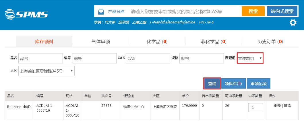 请购物资到货未领取的情况可在SPMS系统中查询: