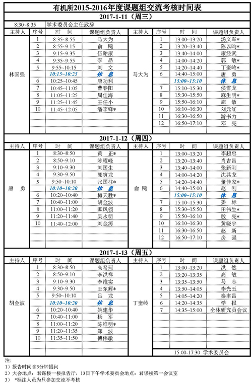 为了推进我所一三五发展规划的落实,鼓励竞争,激励创新,兹定于2017年1月11日-13日(周三到周五),开展2015-2016年度课题组交流与考核工作。
