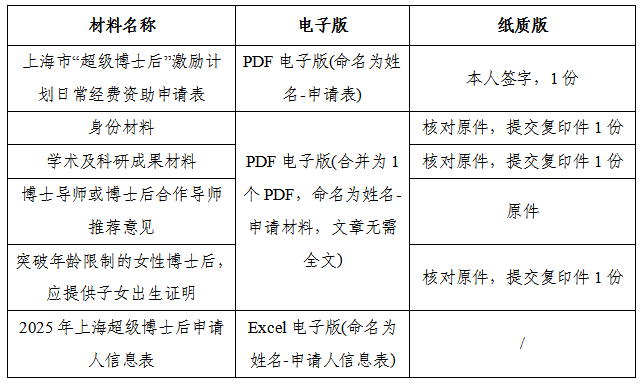 4. 9月17日起通过初审申请人进行遴选推荐,并对拟推荐人进行公示;通过公示的拟推荐人于9月25日前登录“上海国际人才网—上海市博士后项目申报管理系统—上海市‘超级博士后’激励计划申报管理平台”,进行网上信息填报,上传《申请表》及相关证明材料,并完成提交。逾期不再受理。当年度“博新计划”入选者完成网上信息填报并仅需上传《申请表》;