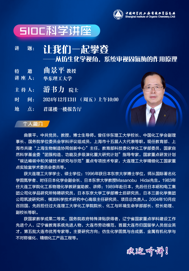 SIOC科学讲座:让我们一起攀登——从仿生化学视角,系统审视固氮酶的作用原理