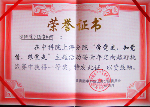 在纪念五四运动92周年,迎接建党90周年之际,上海有机所团委在研究生部的大力支持下,积极组织了我所十多名青年党、团员于4月29日参加了由上海分院团委、上海分院体育协会在辰山植物园联合举行的“学党史、知党情、跟党走”主题活动暨“激情挑战路、浓浓爱党情”青年定向越野挑战赛,队员们通过团结协作,默契配合,最终夺得了比赛一等奖,为有机所争得荣誉的同时,也体现了有机所广大青年与学生的激情与活力。