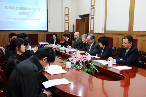 11月14日,美国化学协会下属的美国化学文摘社(Chemical Abstracts Service,CAS)总裁Robert Massie,高级副总裁Matthew Toussant, 副总裁Craig Stephens,中国区销售经理Qiong Yuan等一行7人访问了上海有机所,双方签署了理解备忘录,就CAS使用在有机所的期刊《有机化学》和《化学学报》中发表的实验反应方程等方面的内容达成了共识。有机所将授予CAS永久许可,将有机所期刊出版的所有实验反应过程的详细信息纳入SciFinder,以及其未来产品;SciFinder是世界上最好的化学研究工具,它提供使用世界上最大的由CAS建立的有关化学和相关研究信息的数据库。早在2002年,CAS就在上海有机所成立了中国文献处理中心,该理解备忘录的签署将有助于双方在今后更加稳定、持续、深入的合作。