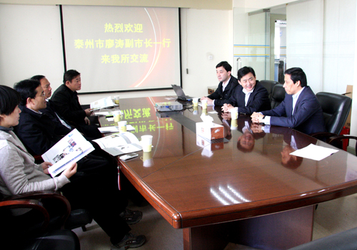 2011年11月21日,由江苏省泰州市廖涛副市长率队,泰州市政府副秘书长李龙根、泰州市科技局副局长邱卜雨等一行到上海有机所调研考察。丁奎岭所长、沈兆雷副所长和科研处的负责同志等接待了考察。