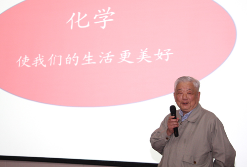 陆熙炎院士和吕龙研究员为本次活动精心准备了科普报告。陆院士以《化学使我们的生活更美好》为题做专题报告,结合生活中的实例,生动地诠释了化学对人类“衣、食、住、行”的贡献,并对同学们提出了热爱化学、认知化学,用化学创造我们更加美好的生活的殷切期望。随后,吕龙研究员做《化学与航天》专题报告,通过介绍航天的发展历程和航天的动力装置,让大家认识到化学不仅仅能使我们的生活更美好,而且化学也与国家航天事业紧密相关。吕龙研究员鼓励同学们向老一辈科学家学习,今后能积极投身到神圣的化学事业中去。在认真聆听报告后,同学们与两位主讲人进行了问答互动,场面十分热烈。
