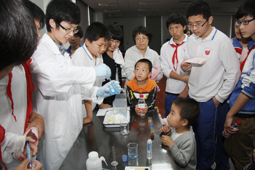 科普专题讲座结束后,来访者在志愿者的引导下分批分别参观了金属有机化学国家重点实验室、生命有机化学国家重点实验室、中国科学院天然产物有机化学重点实验室、中国科学院有机氟化学重点实验室和上海有机所高分子材料研究室集中展示厅。各展厅通过视频、幻灯片、展板、趣味化学实验等多种形式向公众展示了各研究室所涉及的领域及化学与人类生活之间千丝万缕的联系。由各研究室研究员、职工和研究生组成的志愿者们通过耐心讲解和示范,生动地揭示了化学世界的奥妙,来访者兴趣盎然、热情高涨,化学反应过程中产生的颜色和物质形态的变化唤起了大家强烈的兴趣和好奇心。许多同学迫切地想要走进奇妙的化学世界,兴致勃勃地自己动手操作起小实验,体会其中的乐趣所在。