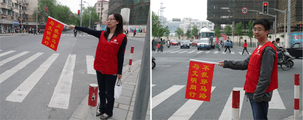 参与此次志愿者行动的,有来自研究室的党支部书记、课题组长,管理支撑部门的负责人,也有科研和管理工作岗位上的普通职工和学生,但是不论是谁,在交通文明行动中他们都化身成为一名普通的交通文明志愿者,无论刮风下雨,风吹日晒,每天准时7点30分,出现在执勤岗位上,挥动着“与文明同行,不乱穿马路”的警示小红旗,劝导来往车辆和行人遵守交通规则,文明安全出行。通过全体志愿者的共同努力,一个月的志愿行动顺利完成,志愿者们默默无闻的坚守,不仅保证了交通的顺畅,也展现了有机所员工和学生服务群众、奉献社会、求实奋进的良好精神面貌。有机所志愿者行动得到了社区的好评。