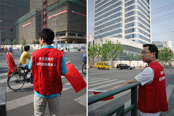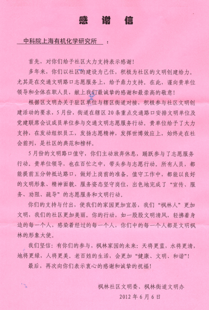 上海有机所在创建上海市文明单位的过程中,积极参与社区文明建设等各项活动,五月份以来,有机所各研究室、各部门的广大党员和群众,积极加入枫林社区交通文明志愿者的队伍,承担了五月份维护枫林路零陵路交通路口的文明秩序的任务,劝阻不文明交通行为。来自全所11个党支部的共计近百名志愿者积极参加,此次活动不仅充分展现了有机所志愿者良好的精神面貌,也为服务社区、承担市级文明单位应尽的社会责任、推动城市文明建设作出了有机所的一份贡献。