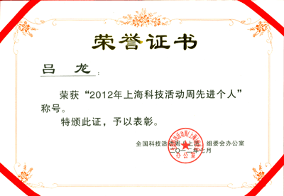 经上海市化学化工学会推荐申报,全国科技活动周(上海)组委会办公室评选,2012年7月,上海市化学化工学会科普工作委员会主任、中科院上海有机所吕龙研究员获“2012年上海科技活动周先进个人”光荣称号。