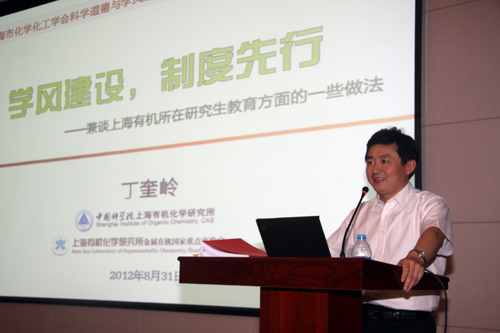 丁奎岭所长的“学风建设、制度先行—兼谈上海有机所在研究生教育方面的一些做法”报告从科学道德和学风建设的必要性和紧迫性谈起,通过正反两个方面的案例,深刻阐明了科学道德和学风建设对于提升创新能力建设,建设创新型国家的重要性。报告中丁奎岭还向与会人员介绍了有机所在研究生教育方面所采取的加强科学道德和学风建设的具体要求和做法,并向大家提出了做一名合格的科技工作者的希望,希望大家在科学研究过程中始终以诚信为本、坚持严谨的作风、采用科学的方法、强调责任意识和多一些人文情怀。