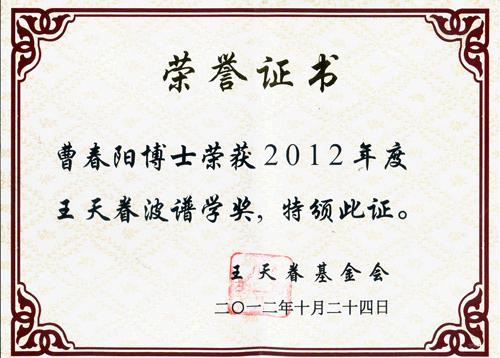 中国物理学会波谱学专业委员会于2012年10月23日至10月28日在福建省厦门市召开第十七届全国波谱学学术年会,会议由厦门大学承办。会议期间评选了第十届王天眷波谱学奖(该奖已被科技部批准为社会力量设奖奖项),波谱学专业委员会将本届的王天眷波谱学奖授予了中科院上海有机化学研究所的曹春阳研究员,中科院武汉物理与数学研究所的唐淳研究员和兰州大学的王为教授。