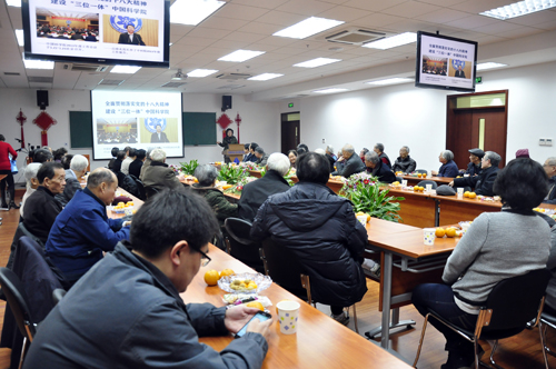 元月25日上午2013年新春团拜会在有机所君谋楼二楼第一教室拉开了帷幕。所领导、有关部门领导、退休正教授、老领导、老干部、院士等共80余人出席了会议。会议由所党委书记郏静芳主持,郏书记首先代表有机所向各位老领导、老同志致以新年的祝贺,祝大家身体健康,阖家幸福,事事如意。并向大家通报了中科院2013工作会议及白院长关于《全面贯彻落实党的十八大精神,建立三位一体的中国科学院》报告的主要精神,并强调指出,要学习贯彻好院工作会议精神,增强责任感、危机感,全力实施好一三五战略规划落实。