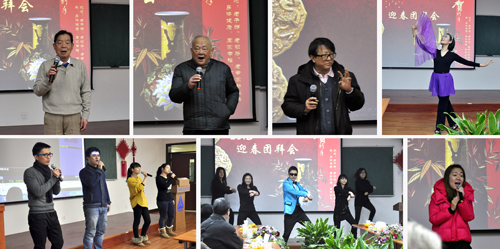 接下来余冰同志主持了文艺表演,机关年青同志以一组《祝福你》合唱正式拉开了团拜会文艺演出序幕。演出中老同志和年青同志进行了互动,退休职工张立真同志为大家表演了舞蹈《梁祝》、老教授陈海宝为大家演唱了一首《红梅赞》、老领导姚介兴为大家演唱了一首解放区名歌《山那边好地方》、机关章云帆等五位年青同志为大家表演了骑马舞,最后新年团拜会在余冰《凤阳花鼓》的独唱声中落下了帷幕。