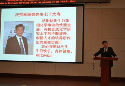 3月7日,中科院天然产物有机合成化学重点实验室举办了庆祝林国强院士七秩寿辰——“Perspectives in Synthetic Organic Chemistry” 学术研讨会。有机所陆熙炎院士、戴立信院士、陈庆云院士,所长丁奎岭、党委书记郏静芳、副所长马大为、唐勇、俞飚和沈兆雷,天然产物有机合成室的赵刚、田伟生、姜标、李超忠研究员以及有机所部分导师、来宾及林国强院士的学生等一同参加研讨会。