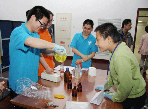 科普专题讲座结束后,来访者在志愿者的引导下分批分别参观了金属有机化学国家重点实验室、生命有机化学国家重点实验室、中国科学院天然产物有机化学重点实验室、中国科学院有机氟化学重点实验室、上海有机所高分子材料研究室和上海有机所分析化学研究室集中展示厅。各展厅通过视频、幻灯片、展板、趣味化学实验等多种形式向公众展示了各研究室所涉及的领域及化学与人类生活之间千丝万缕的联系。由各研究室研究员、职工和研究生组成的志愿者们通过耐心讲解和示范,生动地揭示了化学世界的奥妙,来访者兴趣盎然、热情高涨,化学反应过程中产生的颜色和物质形态的变化唤起了大家强烈的兴趣和好奇心。许多同学迫切地想要走进奇妙的化学世界,兴致勃勃地自己动手操作起小实验,体会其中的乐趣所在。