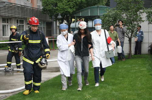 下午3时正,随着3号楼急促的警报声响起,霎时实验楼4楼和1楼大厅浓烟滚滚。在大楼内工作的科研人员和其他工作人员听到警报后立即用毛巾捂住口鼻,紧张有序地从二个疏散楼梯撤离到大楼外的安全地带。与此同时,消防队车呼啸着赶到,消防队员各司其责,拉警戒线,接消防水带,有一小队人员佩戴呼吸器直奔4楼“事故点”扑救……整个大楼人员疏散用时不到3分钟,4楼和地面消防车紧急出水“灭火”!整个演习有条不紊,紧张、严肃而顺利。