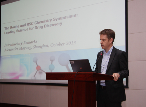 10月24日,由英国皇家化学会(RSC)、罗氏研发(中国)有限公司(Roche)联合主办,上海有机所承办的首届RSC-ROCHE研讨会在上海有机所成功举行。本次会议吸引了两百多位来自国内外各高校、科研院所、及工业界的化学工作者参加。罗氏研发(中国)有限公司药物化学资深总监沈宏博士和上海有机所副所长俞飚研究员任共同主席。罗氏公司全球药物化学总监Alexander V. Mayweg、英国皇家化学会生命科学项目总监Ross Mclaren、上海有机所副所长俞飚研究员分别在开幕式上致欢迎词。
