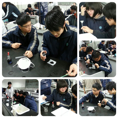 说到大气污染,往往第一个想到的就是雾霾,尤其是最近两年雾霾天数不断增多。邱海波从雾霾形成的原因讲起,除了污染物排放增多外,大气静稳和逆温现象的存在都会增加雾霾出现的可能。随后他又讲述了如何应对雾霾天气,其中一种方法就是佩戴防颗粒物口罩出门。在介绍完口罩的分类及用途后,他向同学们展示了实验室常用的几种口罩,并现场演示了如何佩戴防毒面罩。接着又谈了防毒面罩过滤空气的原理,为了给大家带来直观的感受,在赵吉辰和李冰同学的协助下,大家分组进行了蓝墨水水溶液脱色的小实验。当同学们看到不加任何物质和只加硅藻土的墨水染料都无法被滤纸过滤掉,而加了活性炭的过滤后却得到了无色水溶液,都感觉颇为神奇。