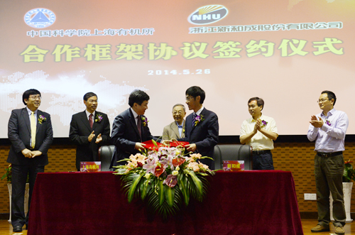 5月26日,中科院上海有机所—浙江新和成股份有限公司战略合作框架协议签约仪式在公司总部报告厅隆重举行。中科院上海有机所戴立信院士、所长丁奎岭院士、吕龙研究员等,新昌县县长马永良、新昌县县委常委副县长吴新宇、新和成董事长胡柏藩、总裁胡柏剡出席了仪式,仪式由浙江大学理学部常务副部长、新和成研究院名誉院长李浩然主持。