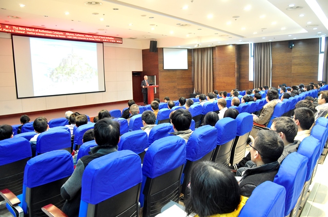 1月23日上午,应上海有机所邀请,法国雷恩大学教授Pierre H. Dixneuf在领取2014年中国化学会 “中法化学讲座奖”荣誉证书后访问有机所,并为全所师生作了题为The New March of Ruthenium Catalysts: Alkynes, Carbenes, Alkenes, and C-H bond Activation的学术报告。报告由丁奎岭所长主持。