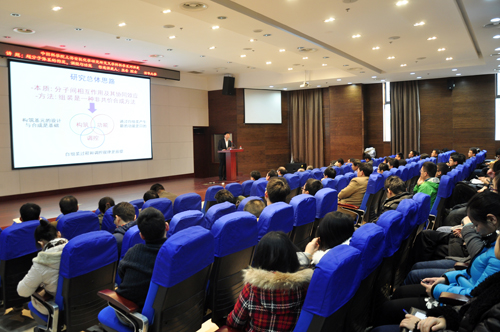 报告伊始,张希院士回顾了四年前在有机所的报告经历,接下来的报告着重介绍了这四年来的研究进展。张希指出:分子层次的化学是基于共价键的合成,而超分子化学是超越分子层次的化学,其核心的科学问题是分子间相互作用,超分子体系的构筑通过非共价键合成来实现,是对传统化学的补充和发展。张希的报告围绕“超分子体系的构筑、调控与功能”这一主题展开:以合成化学为基础完成构筑基元的设计与合成,在此基础上发展新的组装方法和调控策略,从而实现复杂超分子体系的自组装构筑,并由此产生新的功能。张希重点介绍了超两亲分子的自组装及其对外界刺激的响应性能;基于主体增强分子间相互作用的超分子聚合新方法;利用自分类策略实现对超分子聚合过程的调控;具有氧化、还原和射线响应等特点的含硒两亲性嵌段聚合物及其在新型生物医用材料中的应用等。整场报告精彩生动,气氛热烈,现场师生与张希进行了热烈的讨论。