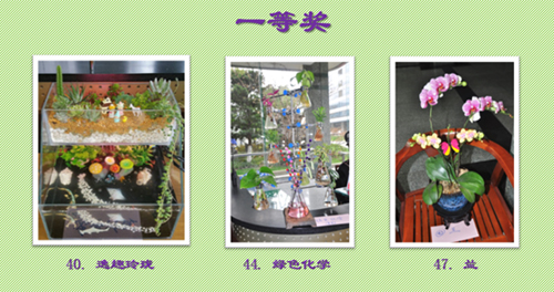 五十三株植物各有特色,创意十足。作品《绿色化学》将多种植物种植在实验室常用的锥形瓶、蛋形瓶中,并用铁架台造型成圣诞树的形状,将绿色植物融入实验生活,真是匠心独运;作品《逸趣玲珑》,鱼缸上层养殖各种多肉植物,下层五彩斑斓的小鱼欢畅游弋,上下两层动静相宜,相映成趣;还有许多特色植物《赛枫叶》、《沙漠绿洲》、《宝莲花》、《生生不息》,也令人大开眼界;正值花期的作品《兰》、《花开富贵》、《如意》,更是令人赏心悦目,微风拂过、香气袭人;这些绿意盎然、创意十足的植物,充分体现了“与植物相伴、让生活多姿多彩”,以及我们有机所职工对生活的热爱。