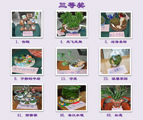 经过两天的现场展示及投票,本次创意植物大赛,评出了一等奖3名,分别是40号作品《逸趣玲珑》、44号作品《绿色化学》及47号作品《兰》;二等奖6名,分别是2号作品《沙漠绿洲》、3号作品《宝莲花》、31号作品《生生不息》、37号作品《花开富贵》、39号作品《赛枫叶》及45号作品《水之森》;三等奖9名,分别是1号作品《古趣》、4号作品《龙飞凤舞》、5号作品《沧海桑田》、8号作品《宁静的午后》、15号作品《守望》、25号作品《温馨家园》、41号作品《甜蜜蜜》、46号作品《春江水暖》及49号作品《如意》。