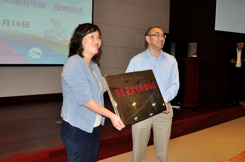 唐勇为本次活动致辞,他对与会嘉宾及同学们的到来表示了热烈的欢迎,他表示上海有机所近年来在科普工作上加大了投入和支持的力度,通过科普演讲、演示科普小实验、开设拓展课程等多种形式,深入社区和学校,积极投身科普宣传和教育工作中。从2012年至今,上海有机所结合全国科技周活动,坚持每年举办“绚丽多彩的化学世界”主题公众开放日科普活动,充分利用现有的科研设施、场所等科技资源向社会开放,向社会公众普及化学知识,激发大众热爱化学、感知化学的热情。同时,唐勇表示,今后上海有机所将再接再厉,争取以更加丰富、生动有趣的内容和形式,开展科普活动,为我国的科普教育事业贡献一份力量。在枫林街道的关心和帮助下,上海有机所“魅力有机化学”科普拓展课程已经在零陵中学、西南位育中学开花结果,获得了师生的认可和肯定,成为了学生热爱的兴趣拓展课程。随后,顾莺为上海有机所颁发了枫林街道“学生社区实践指导站”的牌匾。