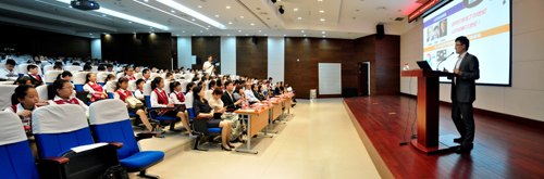 开幕式之后,上海有机所高希珂研究员作了题为《未来的电子世界》的科普报告。该报告入选2015年上海科普大讲坛系列报告。报告回顾了电子科技发展的历史,阐述化学家在电子科技发展中的核心作用。报告详细介绍了当前各类电子产品的发展状况和趋势,向同学们展示了迷人的电子世界,以及未来时尚便携的电子科技产品。高希珂通过视频向同学们展现了砸不烂的显示屏以及可卷曲的显示屏,震撼的视频效果,引得同学们阵阵欢呼。报告结束后同学们积极提问,进行了充分的互动,活动取得了良好的科学教育和宣传效果。
