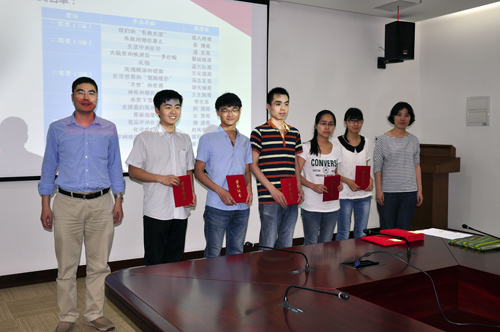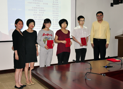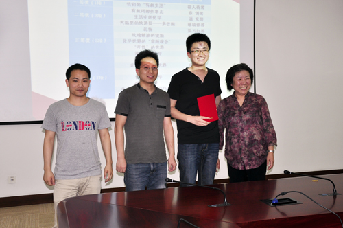 6月10日下午,大赛颁奖仪式在有机所君谋楼二楼第一会议室举行,有机所郏静芳书记,上海市2015年青年五四奖章获奖者李昂研究员、冯琳同志,上海市科技系统2015年青年五四奖章获得者张新刚研究员,党委委员、所长人才专项助理、人力资源处处长刘菲以及党政办公室主任黄智静等为获奖者颁奖。