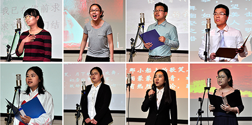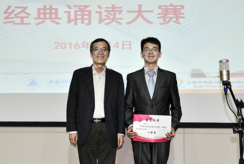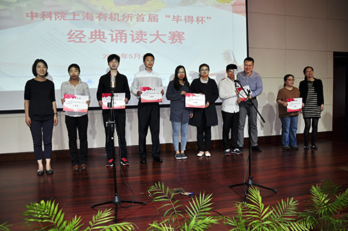 大赛最后,评委老师对选手的表现给予了高度评价,倡导大家多读书,读好书。大赛最终评出一等奖一名,二等奖三名,三等奖七名。来自功能分子的周俊峰凭借食指的《相信未来》,最后以94.6分的高分获得一等奖;来自生命有机的刘迅绅、功能分子的王昭和金属有机的张新分别凭借原创诗《国殇》、《放飞中国梦》和《前赤壁赋》,获得二等奖;来自机关的朱影、刘少娇,生命有机的王旭、付涛、章盈盈,氟化学的徐春晖,交叉中心的杨菲,金属有机的葛懿修获得三等奖。