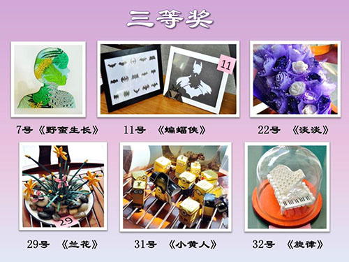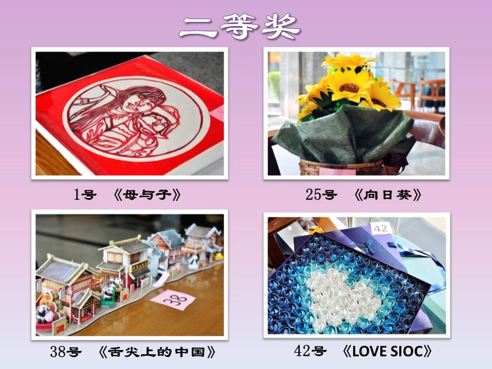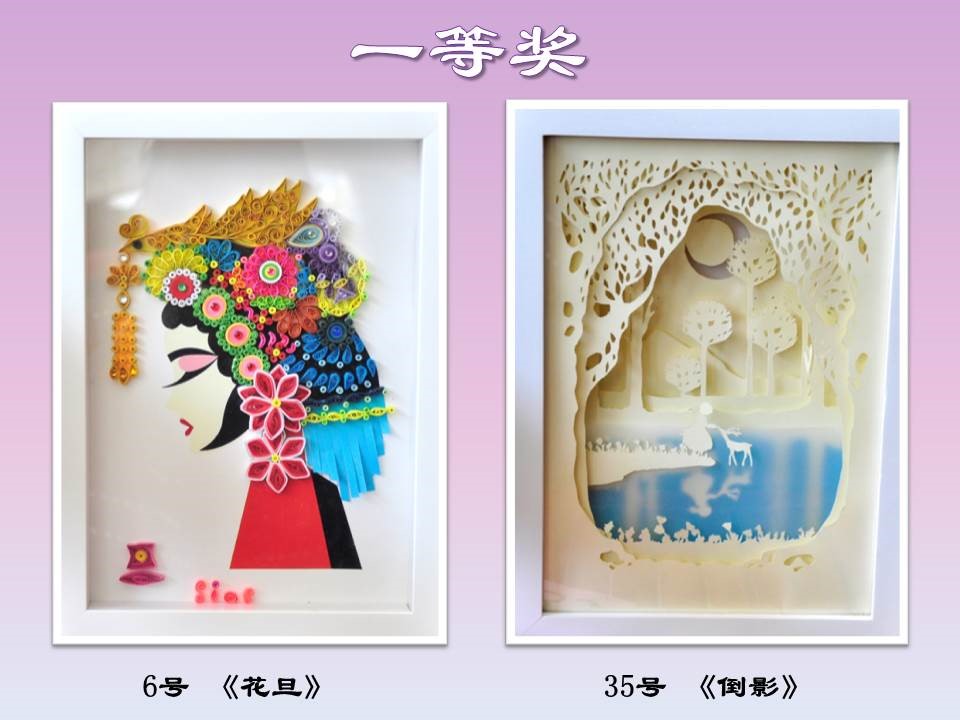 经过两天的现场展示及投票,本次创意纸艺大赛,评出了一等奖2名,分别是6号作品《花旦》、35号作品《倒影》;二等奖4名,分别是1号作品《母与子》、25号作品《向日葵》、38号作品《舌尖上的中国》、42号作品《LOVE SIOC》;三等奖6名,分别是7号作品《野蛮生长》、11号作品《蝙蝠侠》、22号作品《淡淡》、31号作品《小黄人》、32号作品《旋律》。