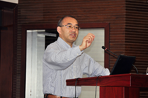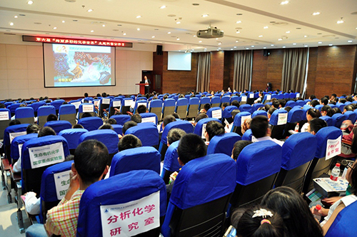 开幕式之后,上海有机所杨军研究员作了题为《海洋的化学卫士》的科普报告。杨军从海洋环境开始讲起,海洋是地球最珍贵的资源,是地球生命的摇篮,随着社会不断发展,人类对海洋的资源越来越依赖,但是另一方面人类的经济活动对于海洋环境造成了愈演愈烈的污染和破坏,而环境的污染最终将对人类的生活造成重大恶劣影响。接下来,杨军从污水、塑料、辐射、油污和金属污染五个方面,通过视频、图片、举例的方式让同学们直观地了解到污染的海洋给人类的生存和发展带来的不利后果,例如水俣病、墨西哥湾泄油、福岛核电站泄露等海洋污染事件所造成的生态损伤和经济损失不可估量。最后,杨军介绍了如何利用合成化学这一武器来对抗海洋污染,把更美好的海洋留给未来。精彩的报告引得同学们阵阵欢呼。