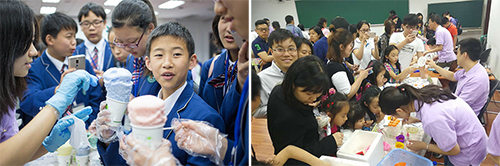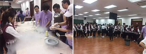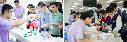 科普专题讲座结束后,同学们在志愿者的引导下参观了个6个趣味实验展厅,展厅里呈现一如既往的火爆,上下午迎来了超过1000位的社会公众。100多位志愿者准备了60多个化学实验,液氮冰淇淋,泡泡火山,彩色鸡尾酒,酷炫风暴瓶……这些实验现象明显,要么颜色变化,要么形态变化,但总是给予参与活动的孩子们意想不到的结果,加上志愿者们耐心到位的讲解,孩子们无不感叹化学的神秘和奇妙,在摊位前久久不愿离去!在活动即将结束时,不少孩子们才开始意识到他们才玩了不到三分之一的趣味实验,这时候的他们一边遗憾地望着忙碌收拾的志愿者,一边喃喃自语:我明年一定还要来……